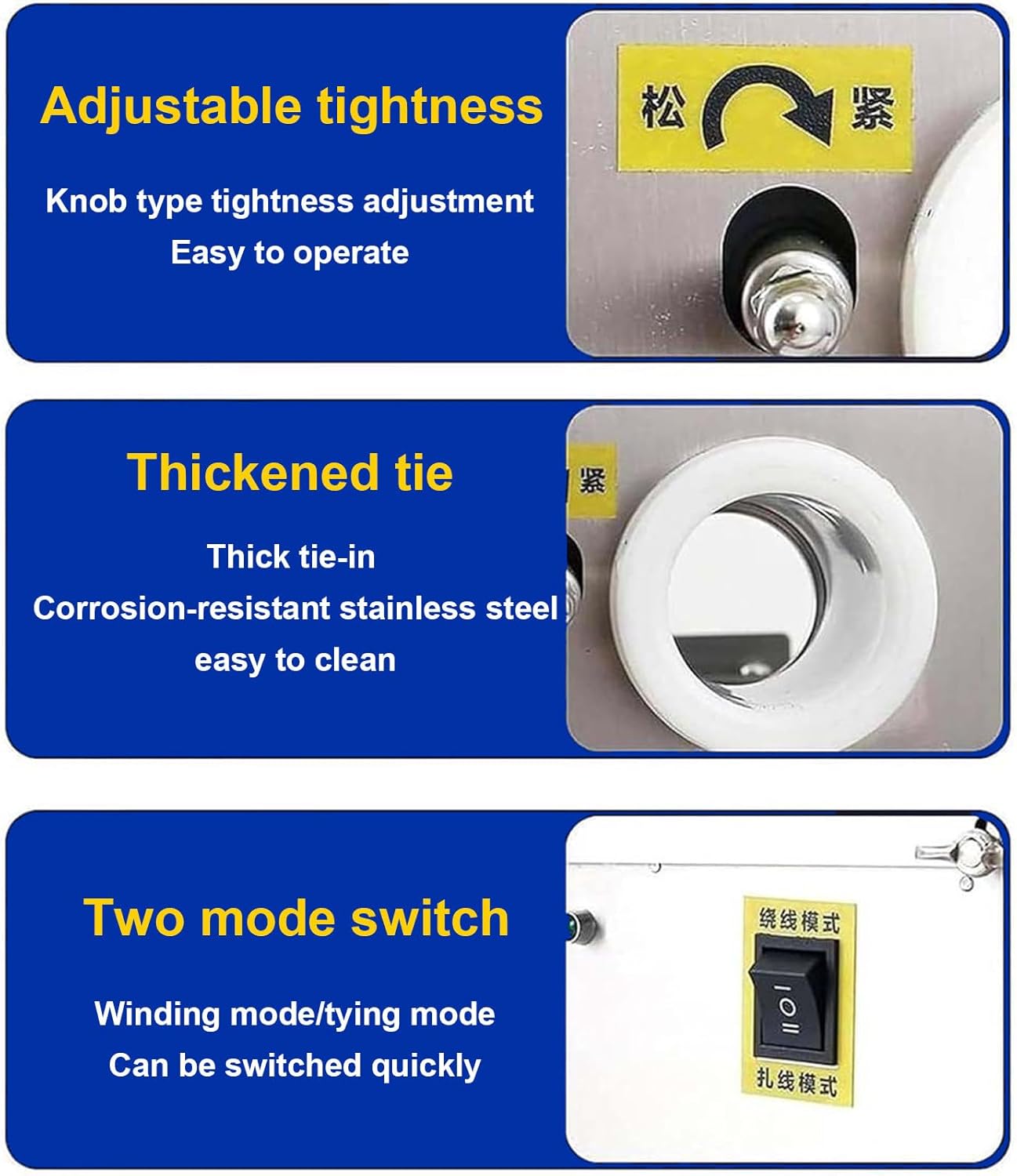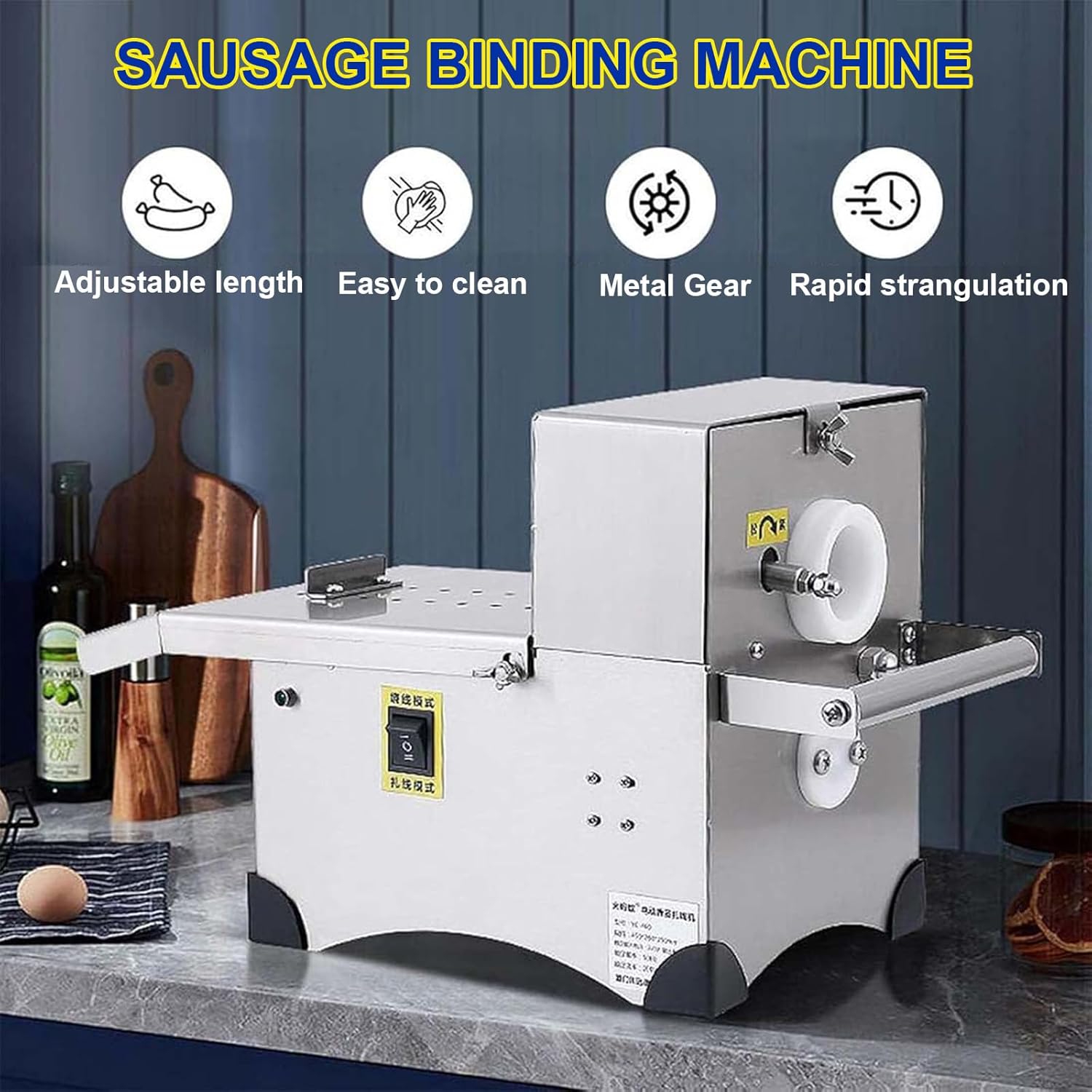 This electric sausage tying machine/automatic stainless steel sausage knot machine/sausage binding strapping machine/electric sausage banding machines is crafted from premium, rust-proof 304 stainless steel. Featuring a 45mm diameter hole and adjustable length settings, it adapts effortlessly to various sausage sizes. With both binding and winding modes, it streamlines your entire workflow, making wire replenishment quick and seamless.FEATURE:1. Boost work efficiency: Bundle sausages quickly and accurately, significantly improving production output.2. Simple use: Just place the sausage in the machine and press the button for seamless binding.3. Secure binding: Premium strapping ensures sausages are tightly secured, preventing them from coming apart.4. Adjustable length: Customize bundling length based on sausage size and hardness for optimal results.5. High-capacity manipulate: Designed with large thread rolls that allow you to process a high volume of sausages without the constant interruption of reloading thread, maximizing your productivity.SPECIFICATION:Name: Automatic sausage making machineMaterial: 304 food-grade stainless steelInput Voltage: 110V-60Hz/220V-50HzPower: 200WMax Diameter: 45mmProduct Size: 435*205*260mmPACKAGE INCLUDE:1 * Sausage Knotting Machine1 * Foot Switch4 * Roll of Wire